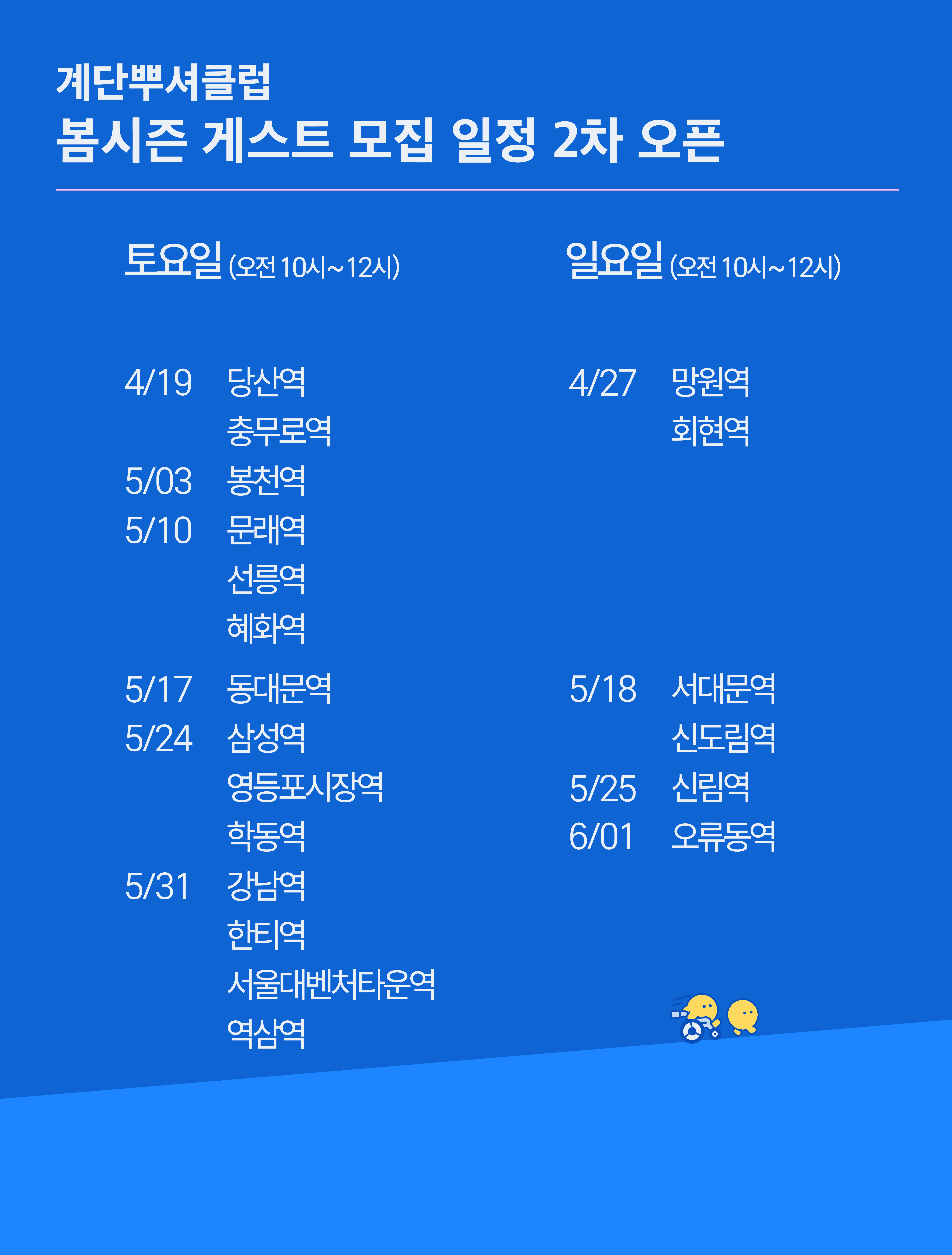 ✔️ 매주 다른 장소에서 토, 일 오전 10시에 시작, 12시에 종료