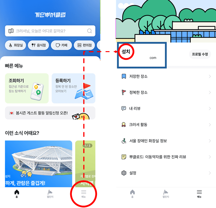 닉네임 확인 방법 화면 하단 메뉴를 클릭해 이동한 뒤, 화면 상단의 동그라미 표시 부분에서 닉네임을 확인할 수 있습니다.